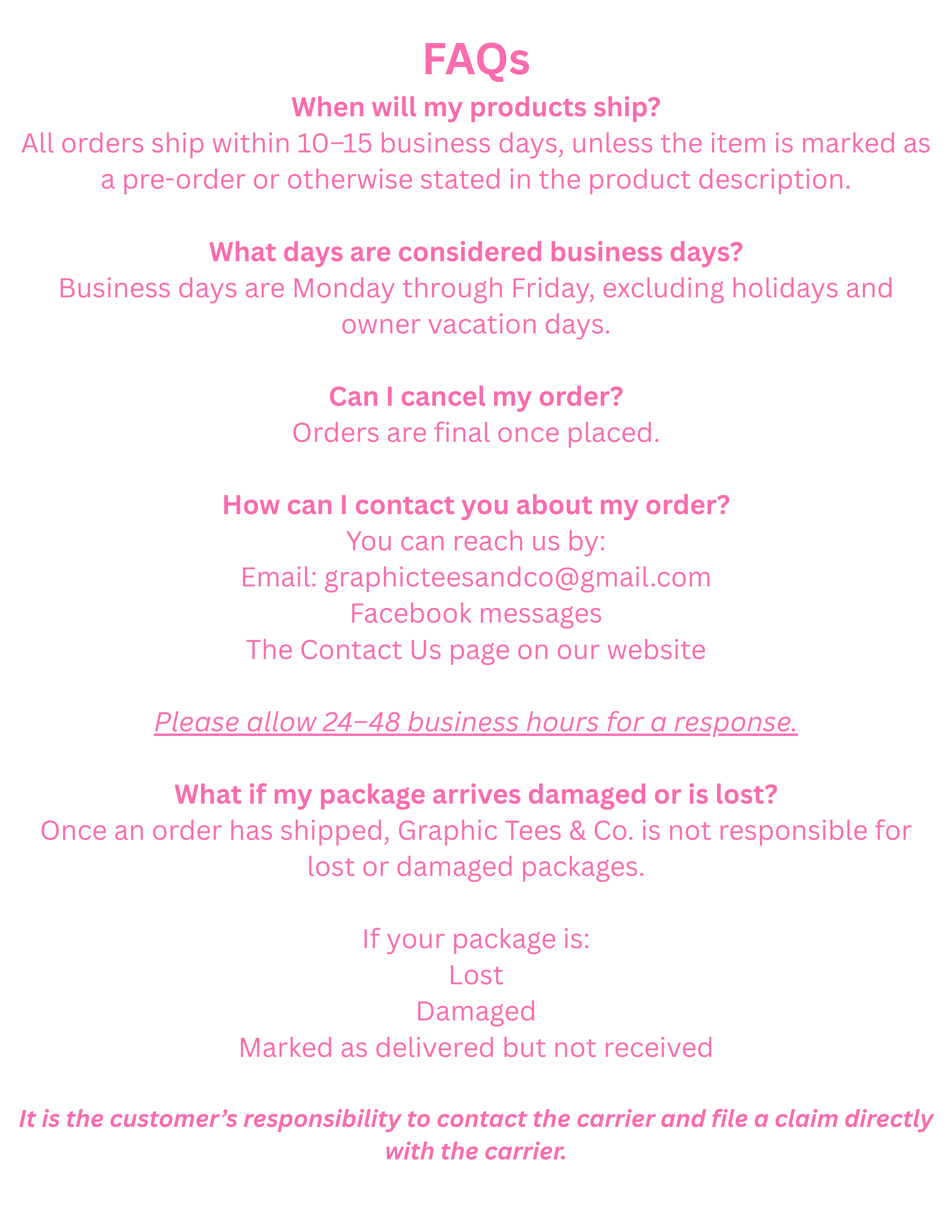 - Once an order has shipped, Graphic Tees & Co. is not responsible for lost, delayed, or damaged packages.